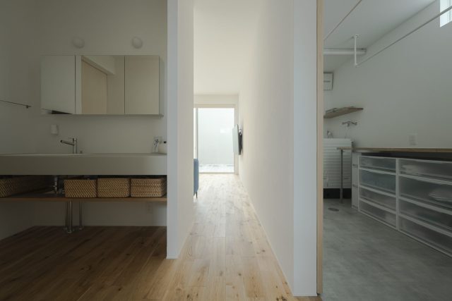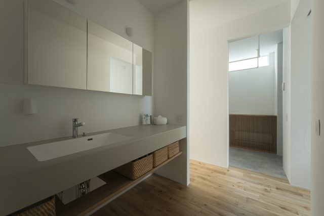 帰宅後すぐに手洗いができる動線 - 宇城市不知火 N House 宇城市不知火 N Houseの施工事例。玄関横に設けた手洗いスペースで、帰宅後すぐに手を洗える安心設計。 宇城市不知火 N Houseはこちら タグ:洗面