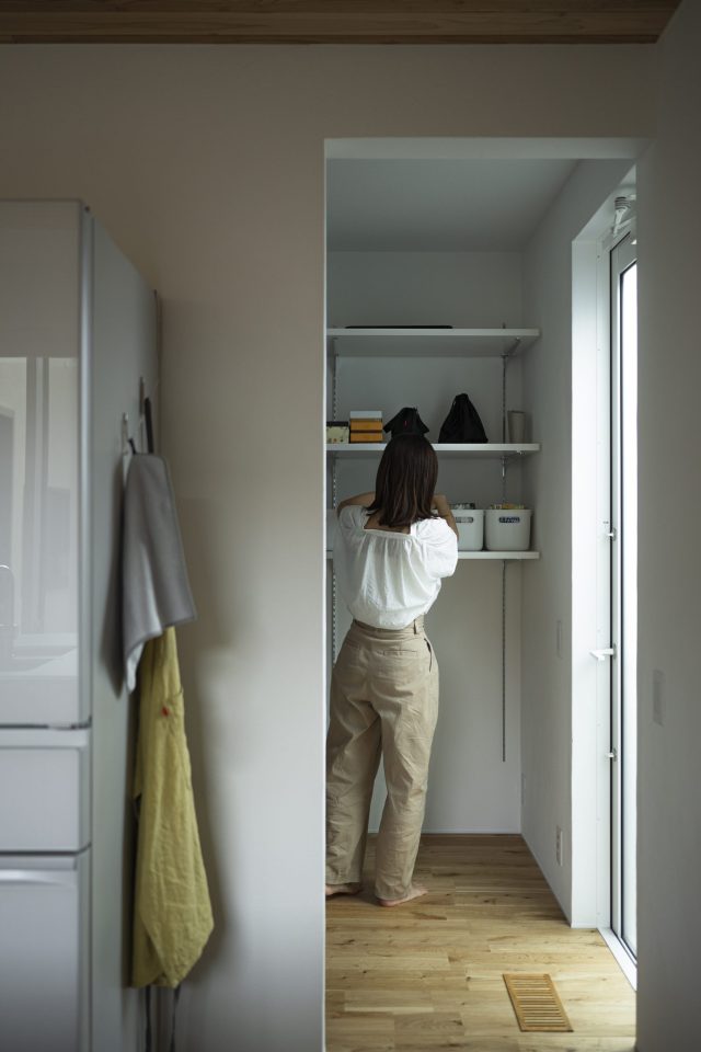 家族の気配を感じるキッチン - 阿蘇市 T House 阿蘇市 T Houseの施工事例。料理をしながら家族との会話が楽しめるオープンキッチン。暮らしに寄り添うデザイン。 阿蘇市 T Houseはこちら タグ:パントリー