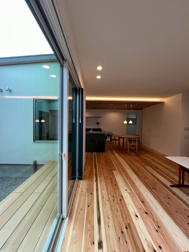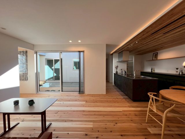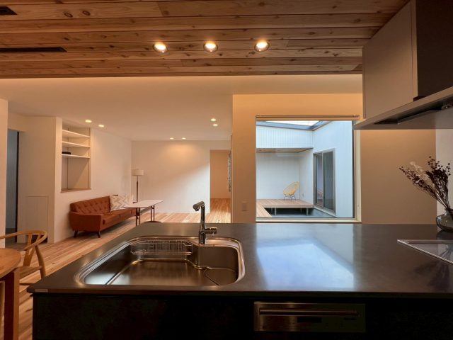 リビングやキッチンからは大開口サッシを通して中庭へと視線が抜け、