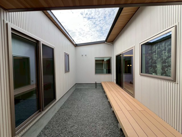 ウッドデッキと砂利敷きを組み合わせた中庭は、