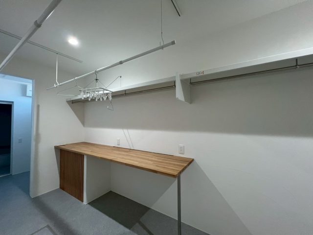作業カウンターや可動式物干しを備え、