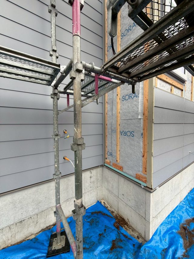 外部では、外装仕上げ工事を行っており、